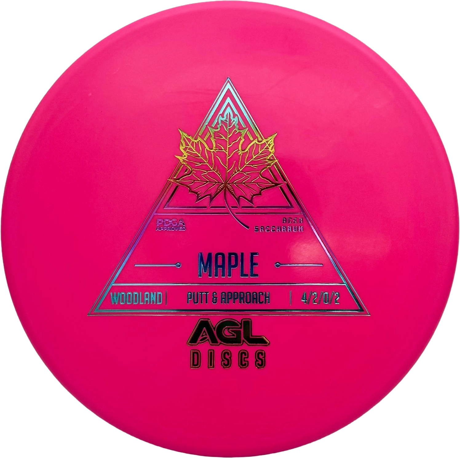 The AGL Discs Woodland Maple is an overstable approach disc built for control and consistency. With flight numbers of 4/2/0/2, it resists torque and maintains stability on both backhand and forehand throws. The Maple delivers a dependable fade and feels solid in the hand, making it a trusted option for upshots and short drives at any arm speed.