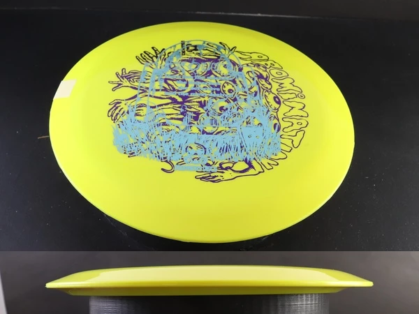 The Abomination by Doomsday Discs is a unique disc featuring a variable rim width that transitions from a 7-speed to a 12-speed width. This allows you to select a rim size that feels most comfortable in your grip. The varying rim thickness can affect the disc's spin while in flight, resulting in a distinctive and dynamic flight performance. As the disasterous events of near future cause civilizations to collapse and species to mutate, it is only fitting that the discs of the future should likewise evolve into different shapes and characteristics.