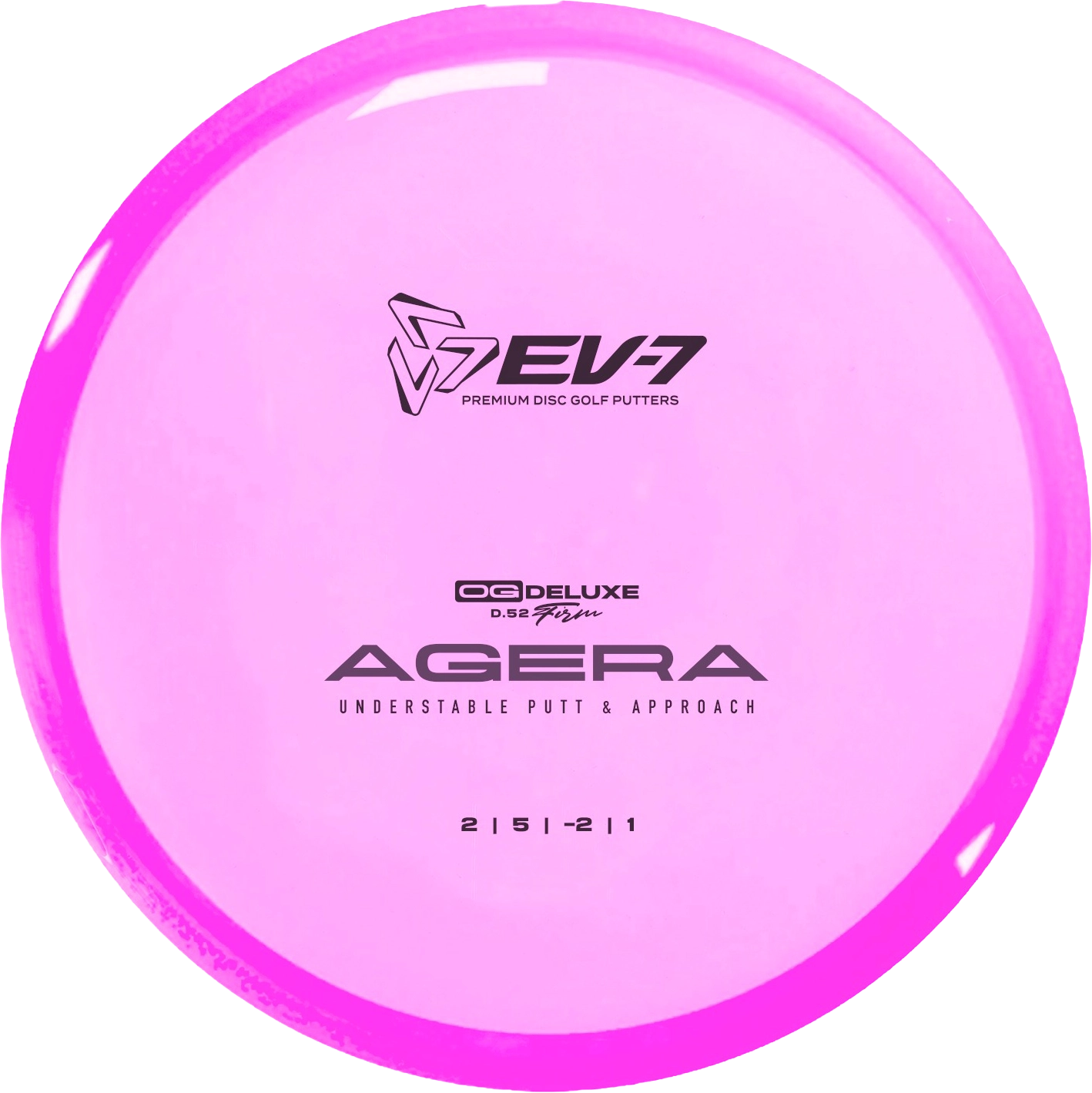 The EV-7 Agera is a versatile putt and approach disc with a shallower rim and a beveled edge closer to a midrange than a traditional putter. This design creates a controllable, understable flight that works well for drives and approaches while remaining smooth and straight on the green.