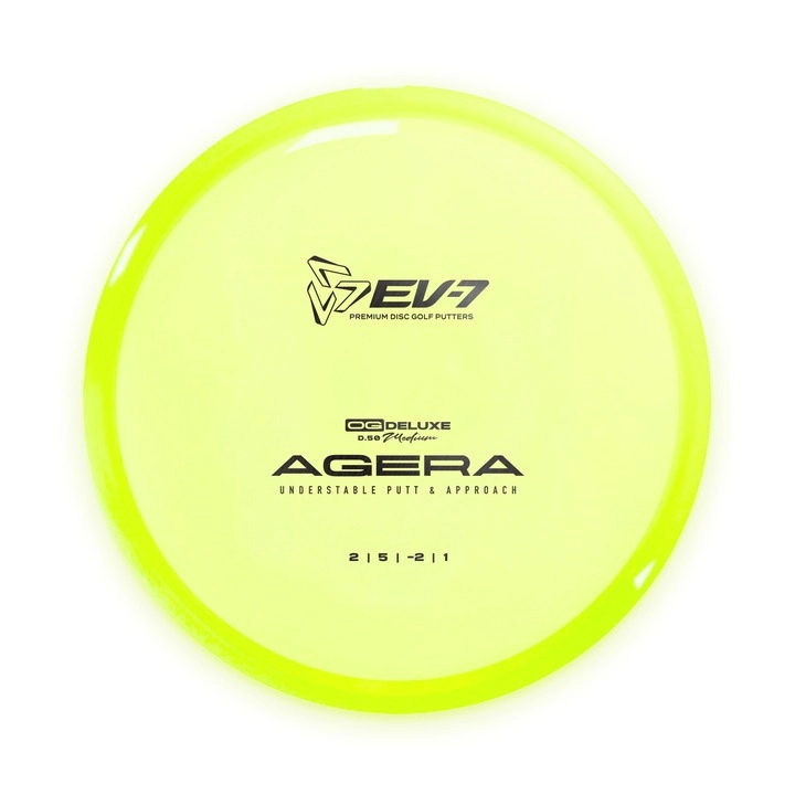 The EV-7 Agera is a versatile putt and approach disc with a shallower rim and a beveled edge closer to a midrange than a traditional putter. This design creates a controllable, understable flight that works well for drives and approaches while remaining smooth and straight on the green.
