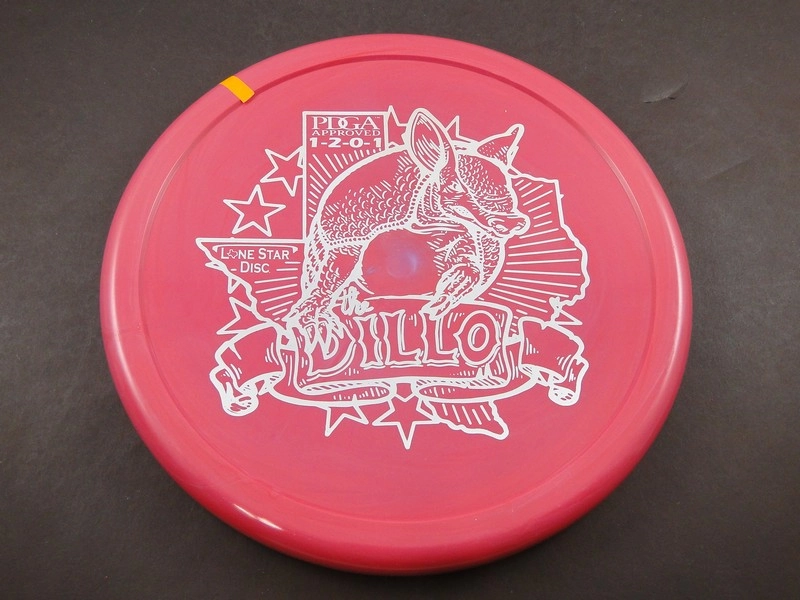 The Armadillo is a low speed and low glide disc. This disc is meant to be accurate and offer great control It has a thumbtrack on the disc for comfort. It is an easy disc to control, and will fly consistently to provide good accuracy. Lone Star says, "Our newest Putt and Approach disc holds true to its namesake with its Blunt Nosed Rim and Thumbtracked Shoulder that forces this disc to fly straight as an arrow with a reliable fade to its intended target."