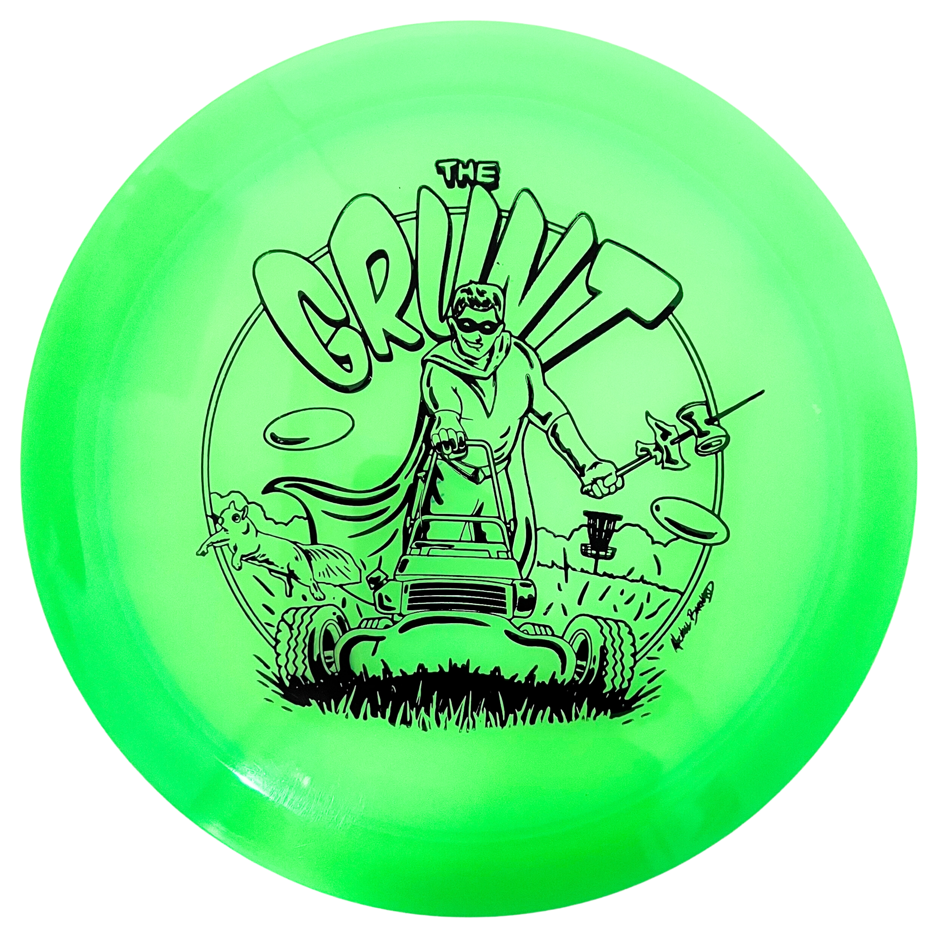 The Grunt is a control driver that does the grunt work for you. For those with a slower arm speed, it is great for backhand/forehand flex shots when needing a bit more distance or for carving out lines through a fairway. Players with a higher arm speed could use this disc for long straight lines with a reliable finish at the end.
