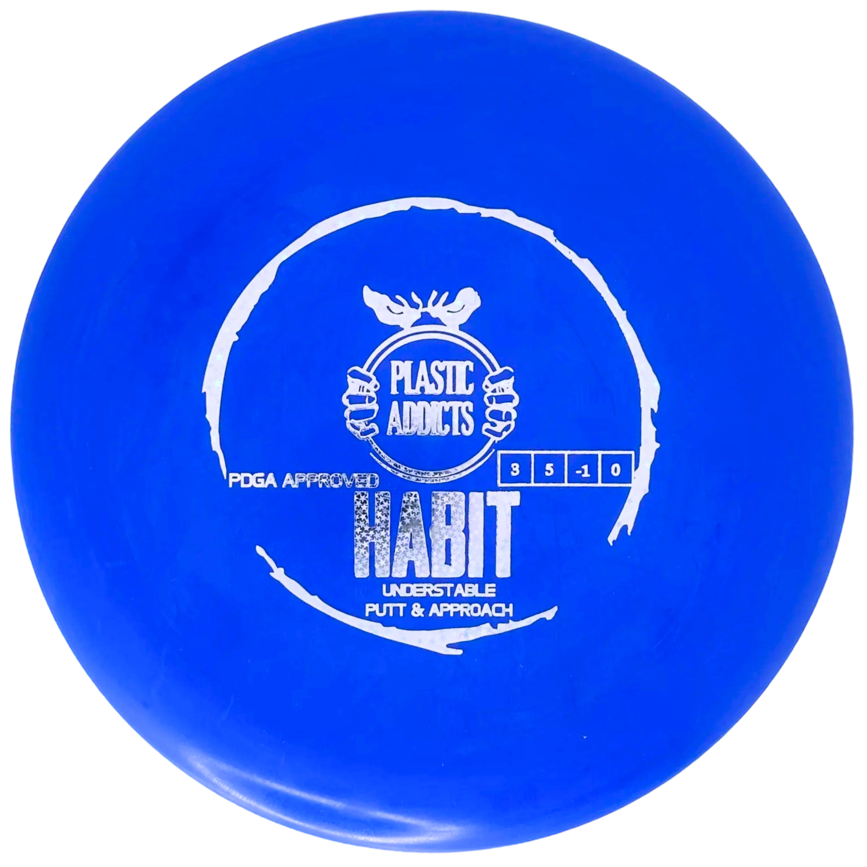Disc golfers have an addiction to plastic, or maybe you could say it’s a Habit? Whatever it is, fill your cravings with this disc from Plastic Addicts: the Habit. The Habit is a stable putter with the glide and range of a midrange that will always give you the straight flight you’re looking for. If you’re looking for a dependable straight-flying putter, look no further than the Habit from Plastic Addicts.
