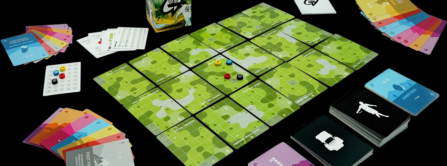 It's actually an interesting way to play; you cycle through disc cards with flight paths in grids, modify them with cards either pushing it farther distance or moving it left or right fade, then draw a card to see the outcome of your throw. You discard the cards after each throw, and refill your hand, meaning you can't just repeat that great shot twice.