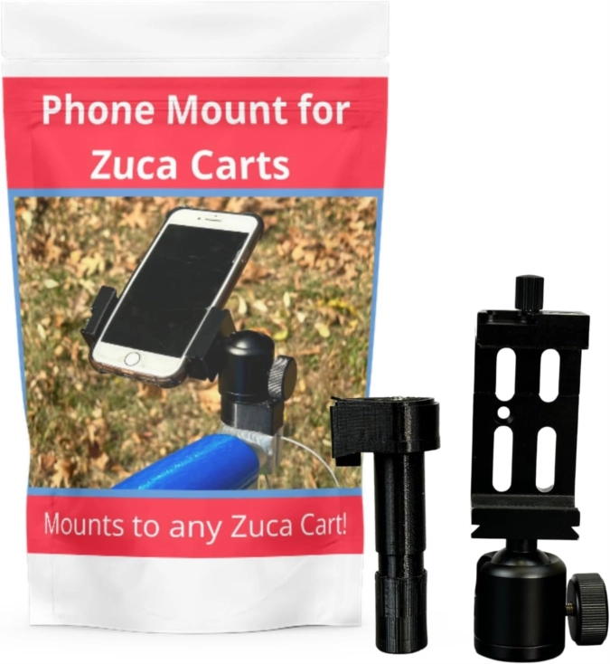 From the FlighTowel 3D Shop comes an impressive addition for the Zuca cart: the FlighTowel Cart Stud and Phone Mount. This setup is highly functional, starting with a custom-made base featuring a standard 1/4 20 stainless steel stud, which can attach various photo mounts. Its versatility is unmatched. Additionally, a robust ball mount allows for swiveling the phone to any desired position, easily switching between portrait and landscape modes with a simple knob twist.