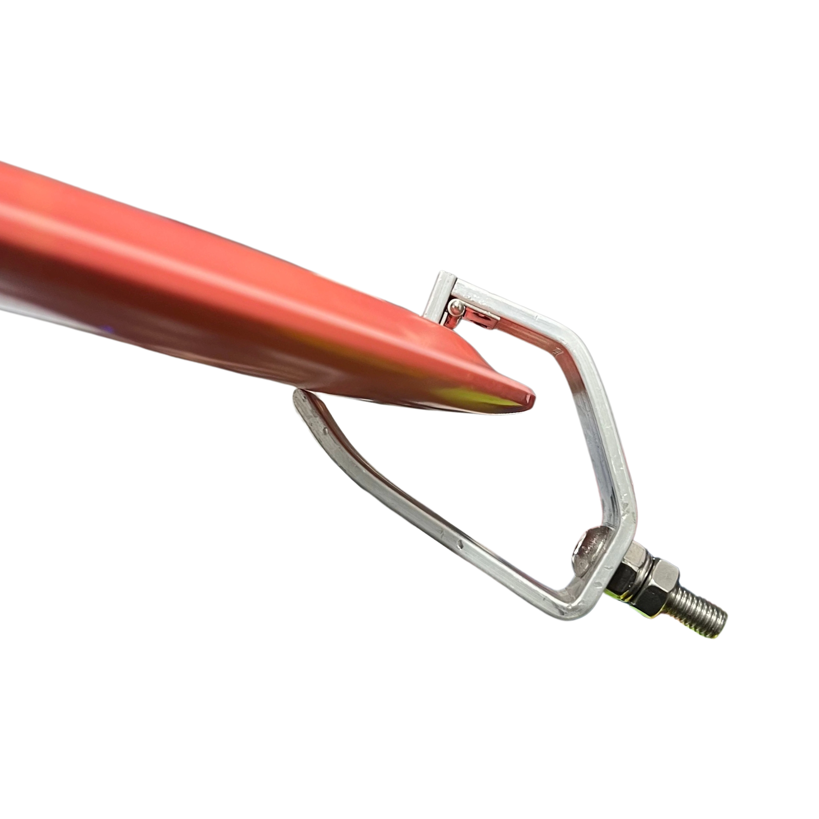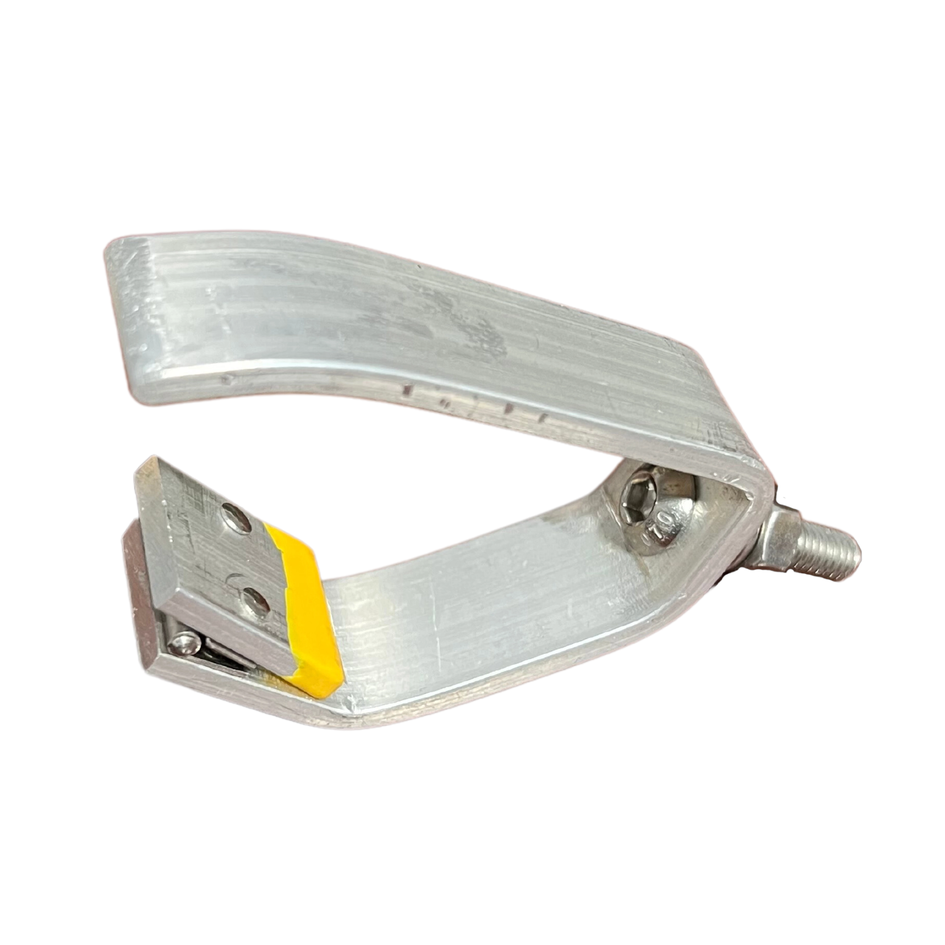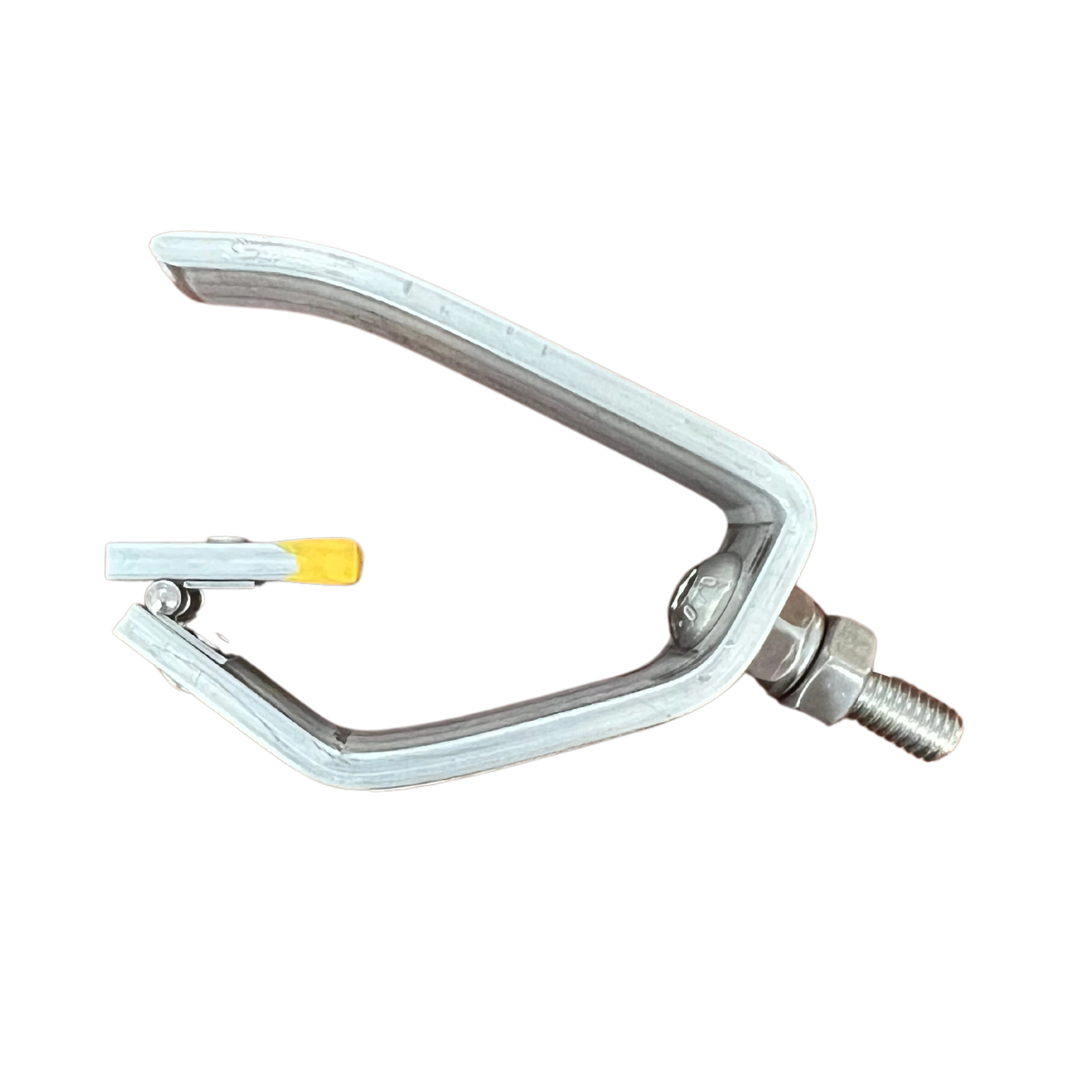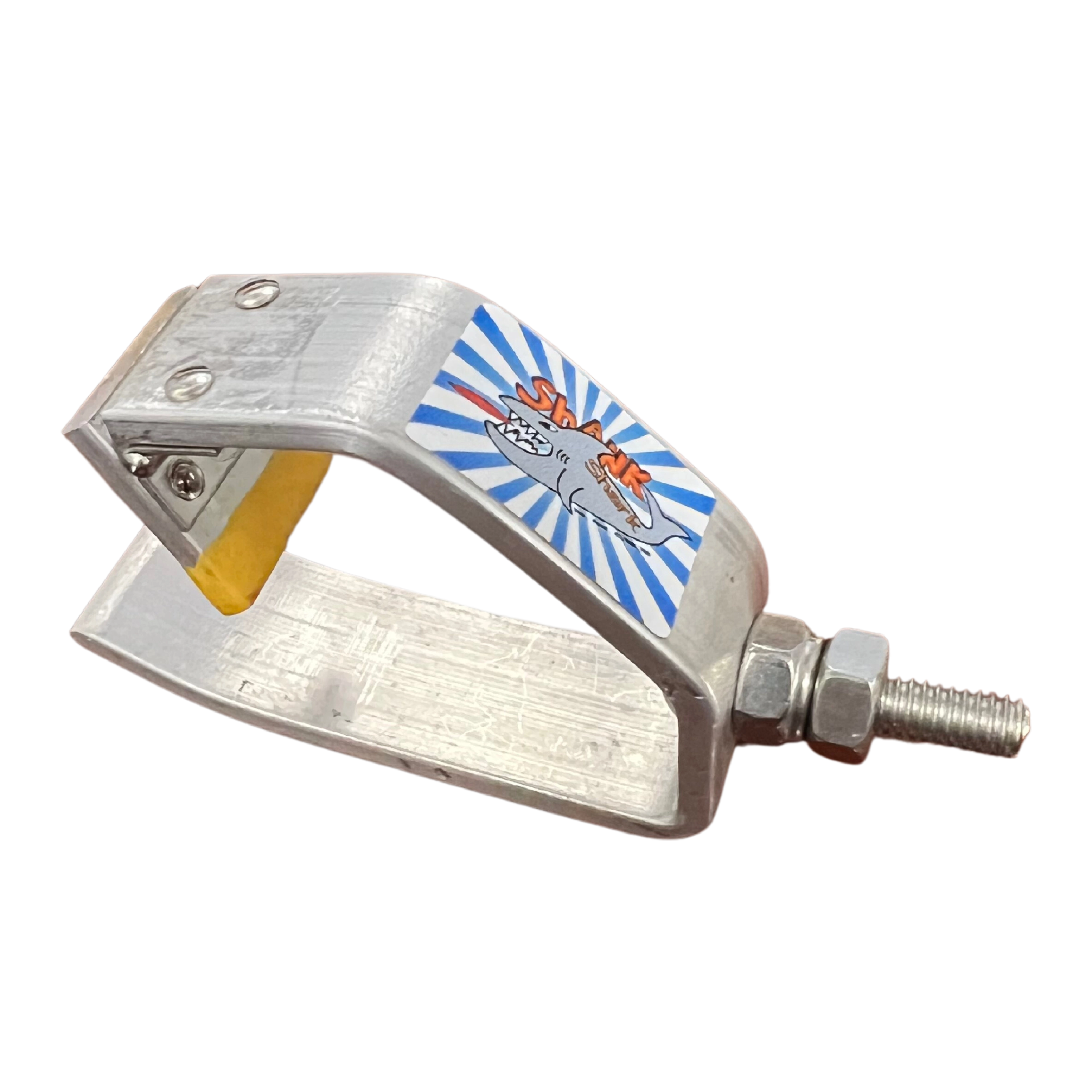 Looking for a durable retriever attachment with the bite of a shark? The Shank Shark! is a hand machined disc grabber designed to lock onto your disc and grab it from whatever awkward place it strayed to. The hinged flap bites down on your disc as you move it to make retrieving discs easier than using a standard hook attachment.