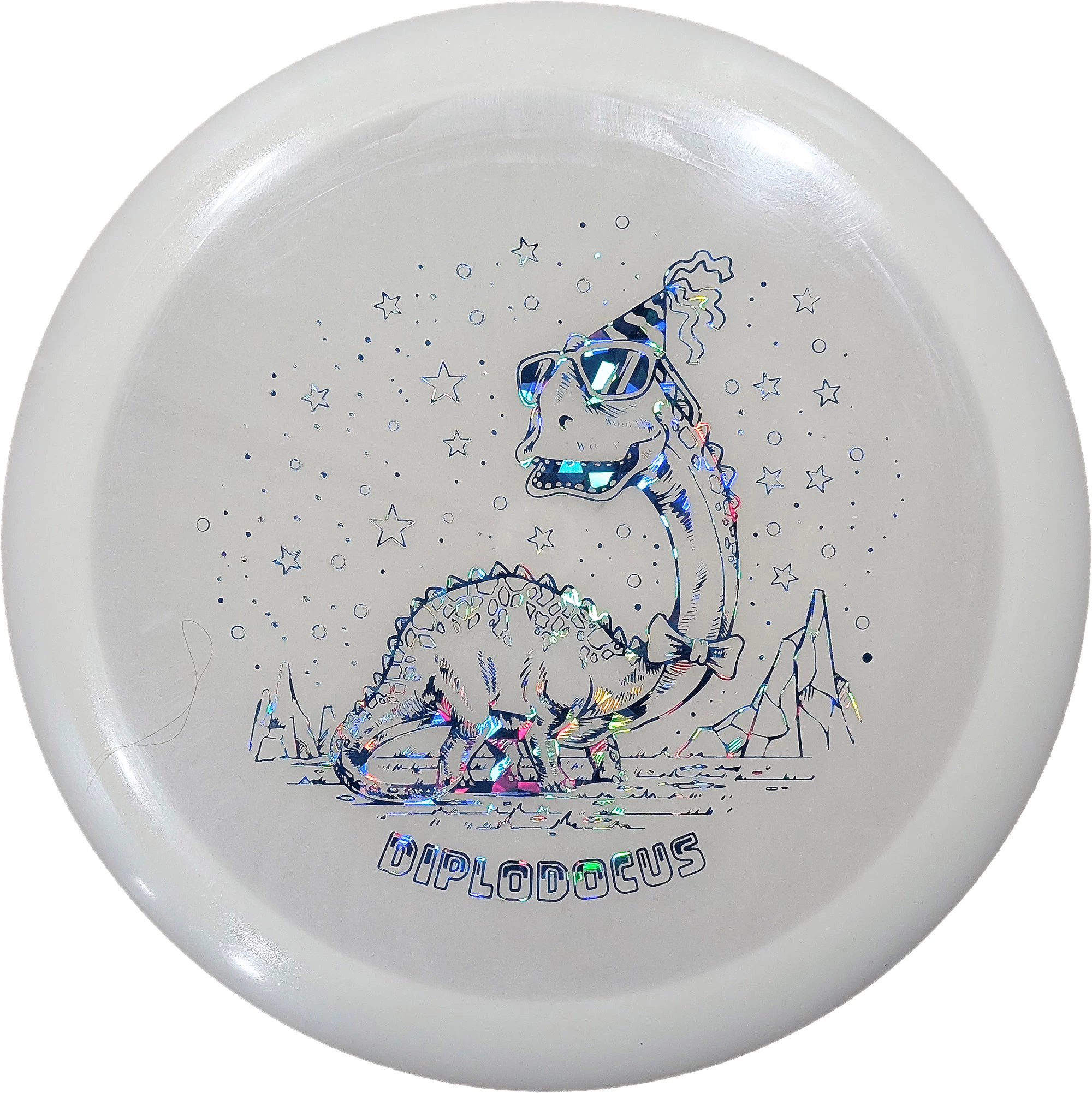 The Diplodocus is an easy-to-throw fairway driver disc that is ideal for young players or new disc golfers who want a disc that is easy to handle. The rim is comfortable for small hands and it is also an understable disc, meaning that it more fade-resistant for straight flight paths. The Diplodocus may or may not have a dimpled center on the top of the disc.