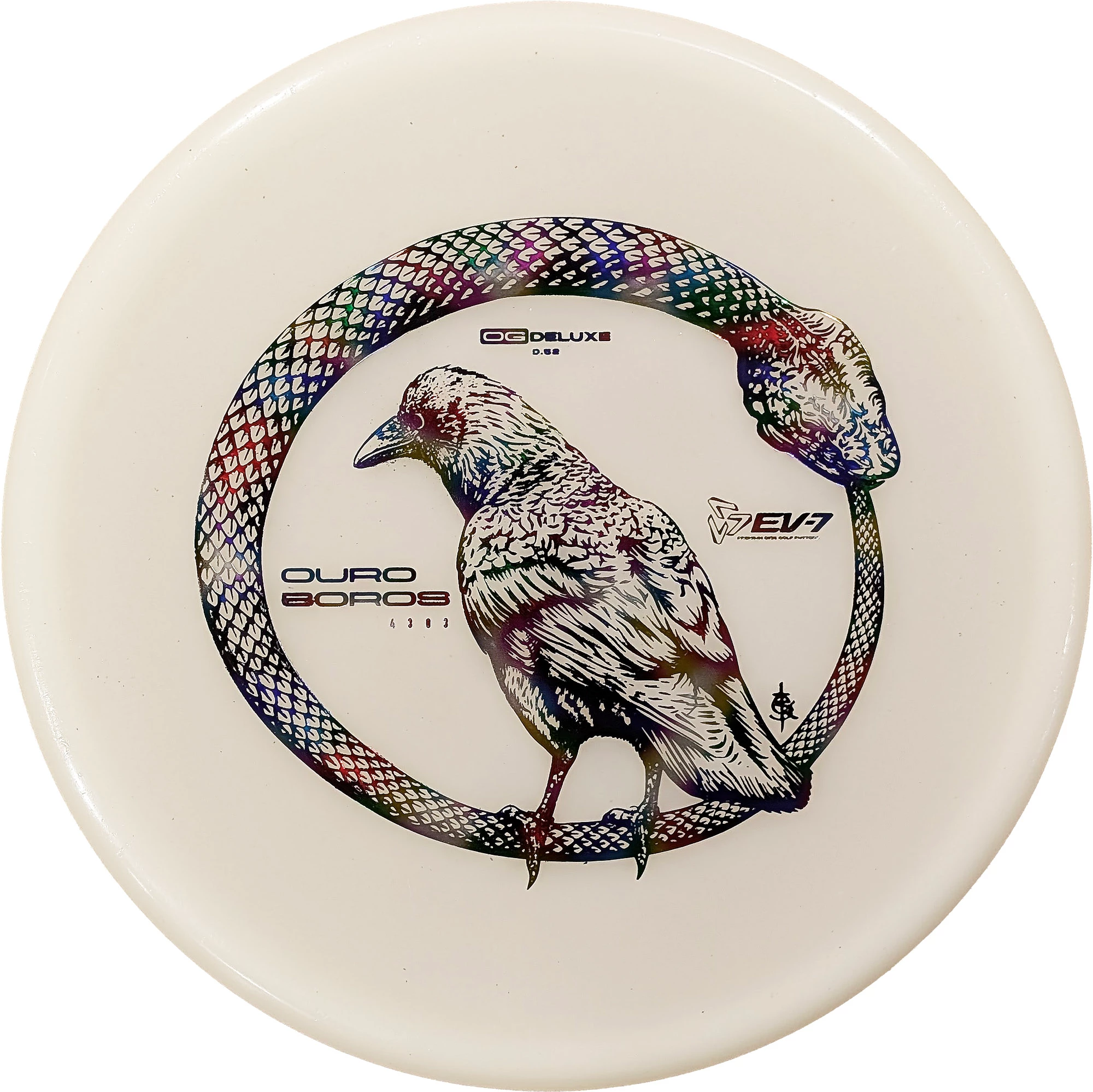 The EV-7 Ouroboros is an overstable approach putter designed for reliable, torque-resistant flights. Developed with input from Dr. Charlie Booras, it offers a touch more stability than discs like the Zone while maintaining controlled distance and consistent finish. It handles power well and holds its line before finishing with a strong, dependable fade, making it a trusted option for approach shots in the 280 to 320 foot range.
