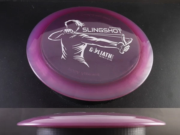 The Goliath Discs Slingshot is a big distance, 13-speed driver that is not for the feint of heart. The Slingshot is a straight flyer, featuring some turn and some fade. This disc has the potential to take your distance game to the next level.