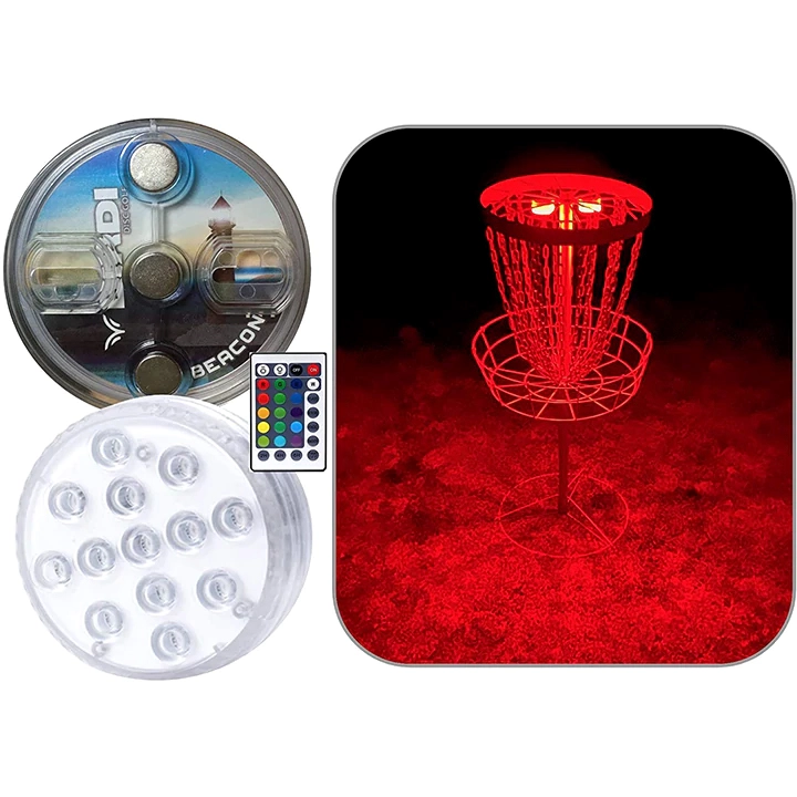 This LED light is magnetized and bright enough to attach to a disc golf basket and be seen easily at night. This light is controlled by a remote, and can change from solid color, fade mode, and flash mode. This light makes it easy to see the basket, and play those night rounds.This comes with two LED Disc Basket Lights.