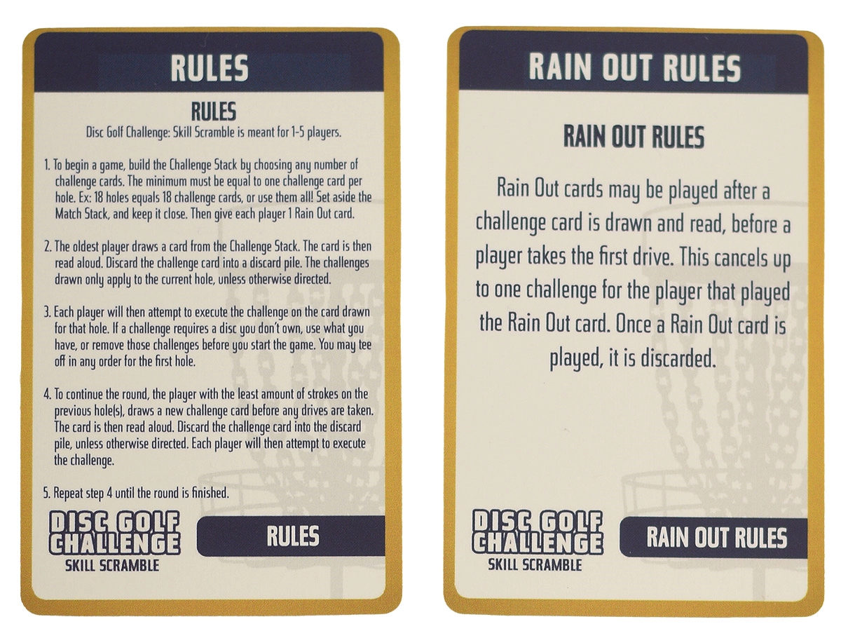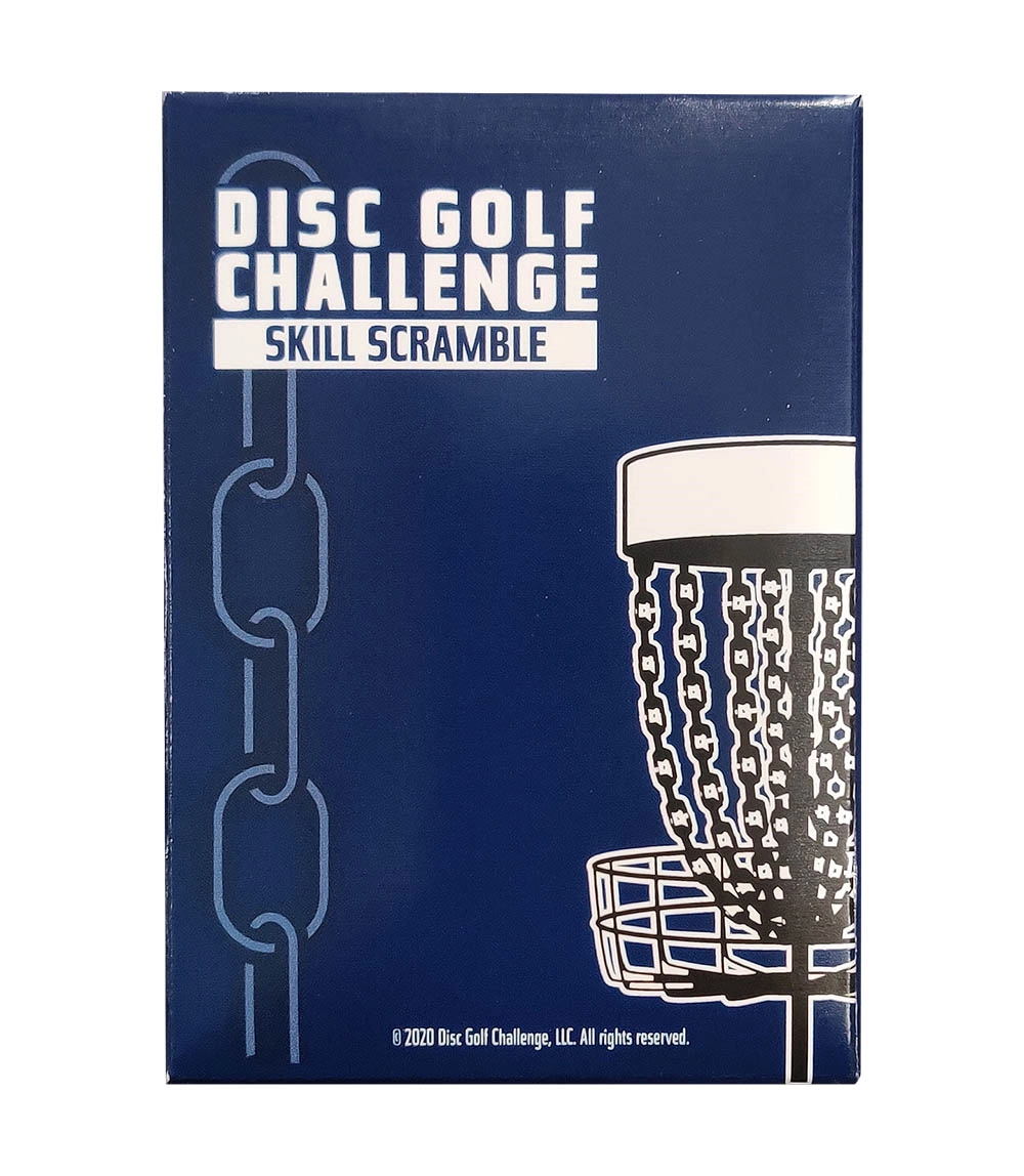 From the back of the box: "Disc Golf Challenge: Skill Scramble helps to introduce new players to the sport of disc golf while also providing longtime players with a new way to compete and be challenged! Whether you have thrown a thousand discs, or you're picking one up fo rhte first time, the Disc Golf Challenge: Skill Scramble card game is here to help you learn and grow! So, grab some friends, or test your limits playing solo, to see if your disc golf skills get scrambled!