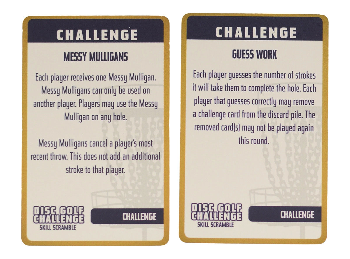 Disc Golf Challenge: Skill Scramble, is a new and exciting Disc Golf card game that is designed to attract and teach new players, as well as offer casual competition for long time players through a "king-of-the-hill" style of round. The game can be played with 1-5 players, with as little as 1 disc.