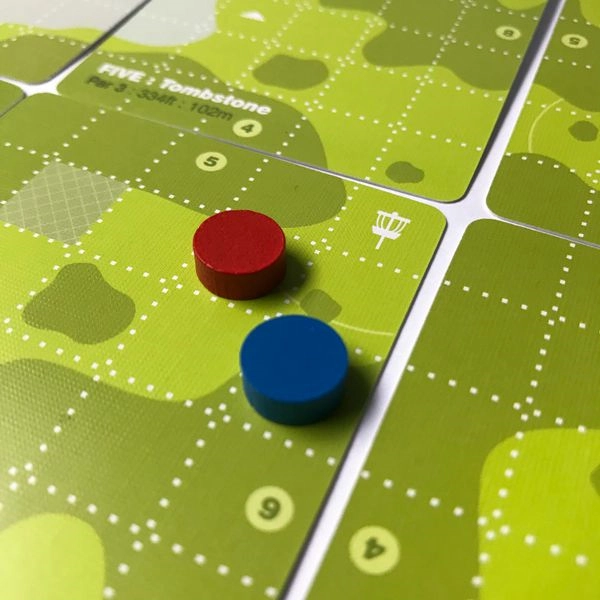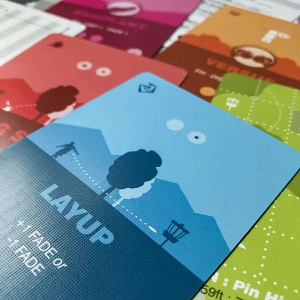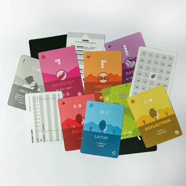 It's actually an interesting way to play; you cycle through disc cards with flight paths in grids, modify them with cards either pushing it farther distance or moving it left or right fade, then draw a card to see the outcome of your throw. You discard the cards after each throw, and refill your hand, meaning you can't just repeat that great shot twice.