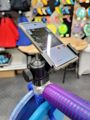 The phone mount itself is made of sturdy aluminum and fits phones ranging from 2.5" to 3.5" wide, accommodating phones with or without cases (a case is recommended). This reliable phone mount ensures it can withstand a round of disc golf, having been rigorously tested on the toughest courses in Oregon.