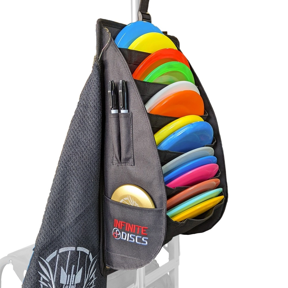 It has become a number-one preferred accessory for any disc golf cart. It attaches to your cart handle and easily holds ten to fifteen go-to discs within easy reach. It also has room for a mini, clipboard or phone, and pencils. The XXL also features an additional accessory pocket for a snack or other item. No more bending down for your favorite discs! Attaches to telescoping handle of most disc golf carts.