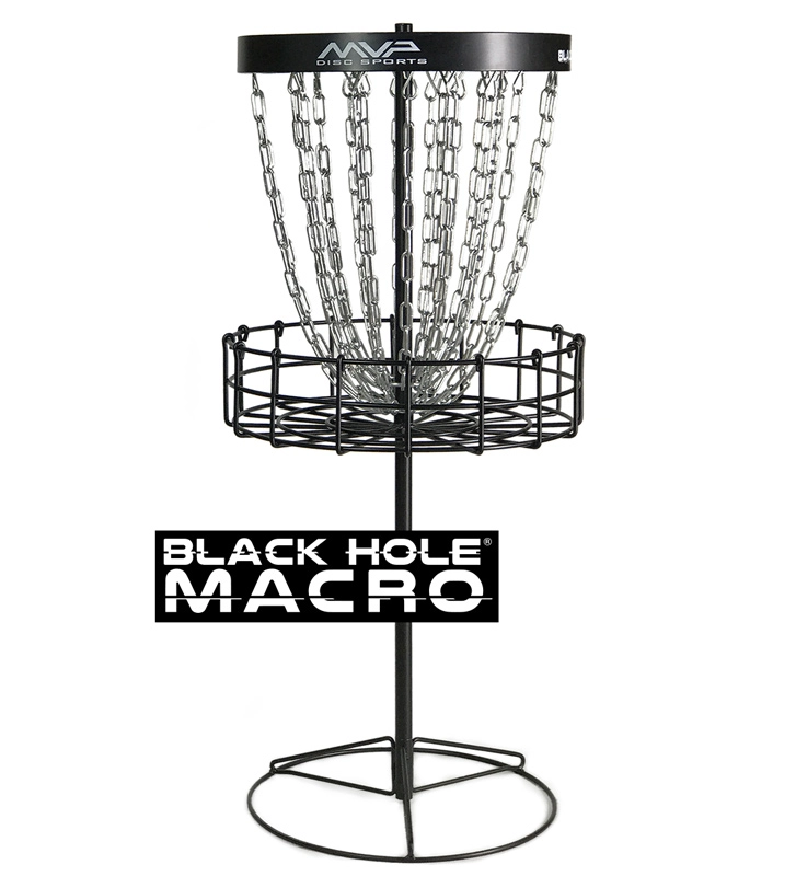The Black Hole Macro is a smaller sized basket at 39" tall with an 18" diameter. It's basically a 3/4-scale disc golf basket that works great for mini discs like the macro Tesla! It has two rings of 12 chains each, totaling 24 strands.