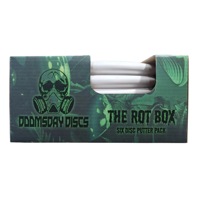 The Doomsday Discs Rot Box is designed to improve your disc golf performance. This set includes six identical Rot putters at an unbeatable price, perfect for honing your skills during practice sessions. Each putter comes in durable Ration plastic, with three black and three white discs. The putters weigh between 170-174 grams.