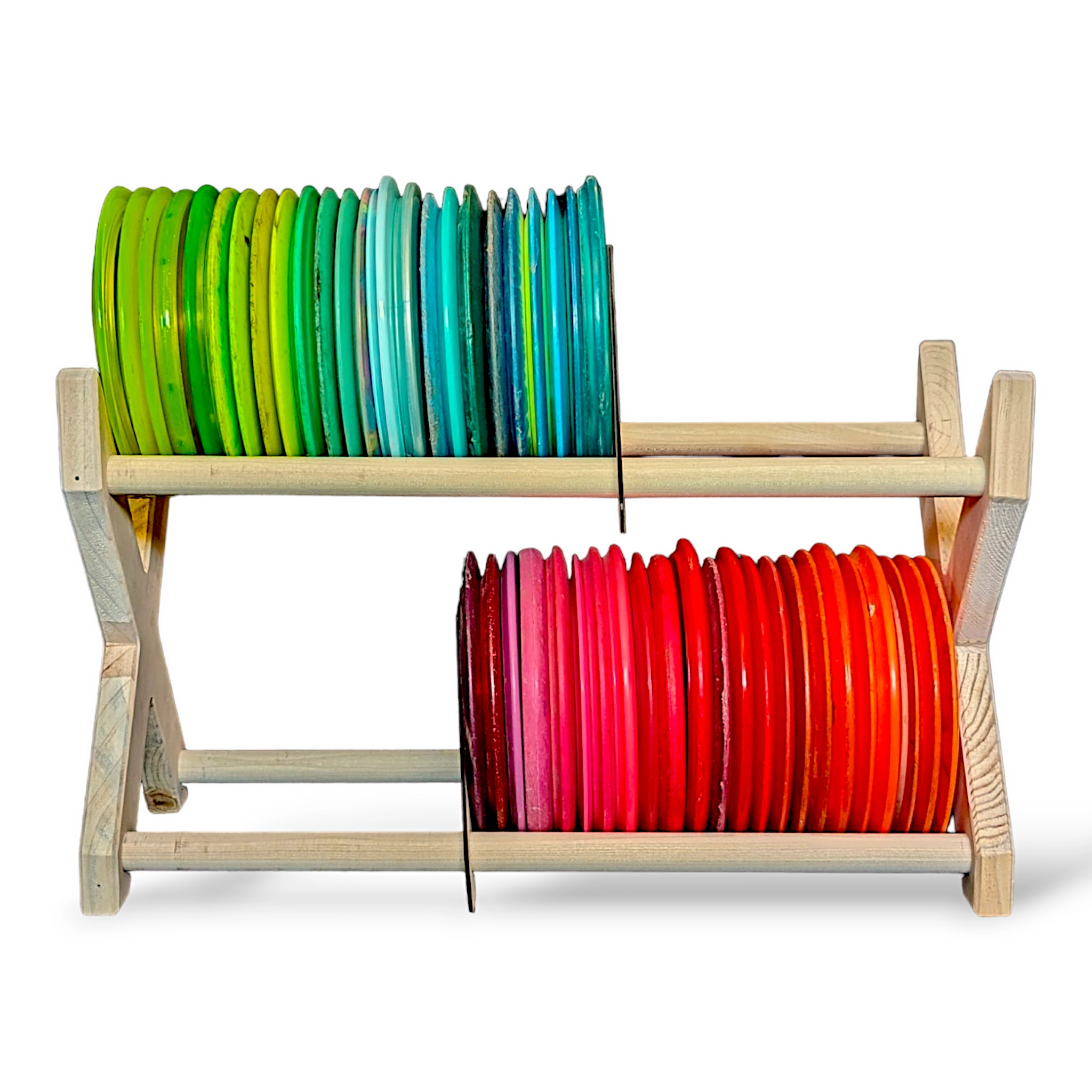 Design: Discs rest between two 1" dowels and each level includes a laser-cut disc divider to ensure discs are held in place even when moved, bumped, or tilted to severe angles. The racks are sanded to a smooth finish and require a small amount of setup once received.