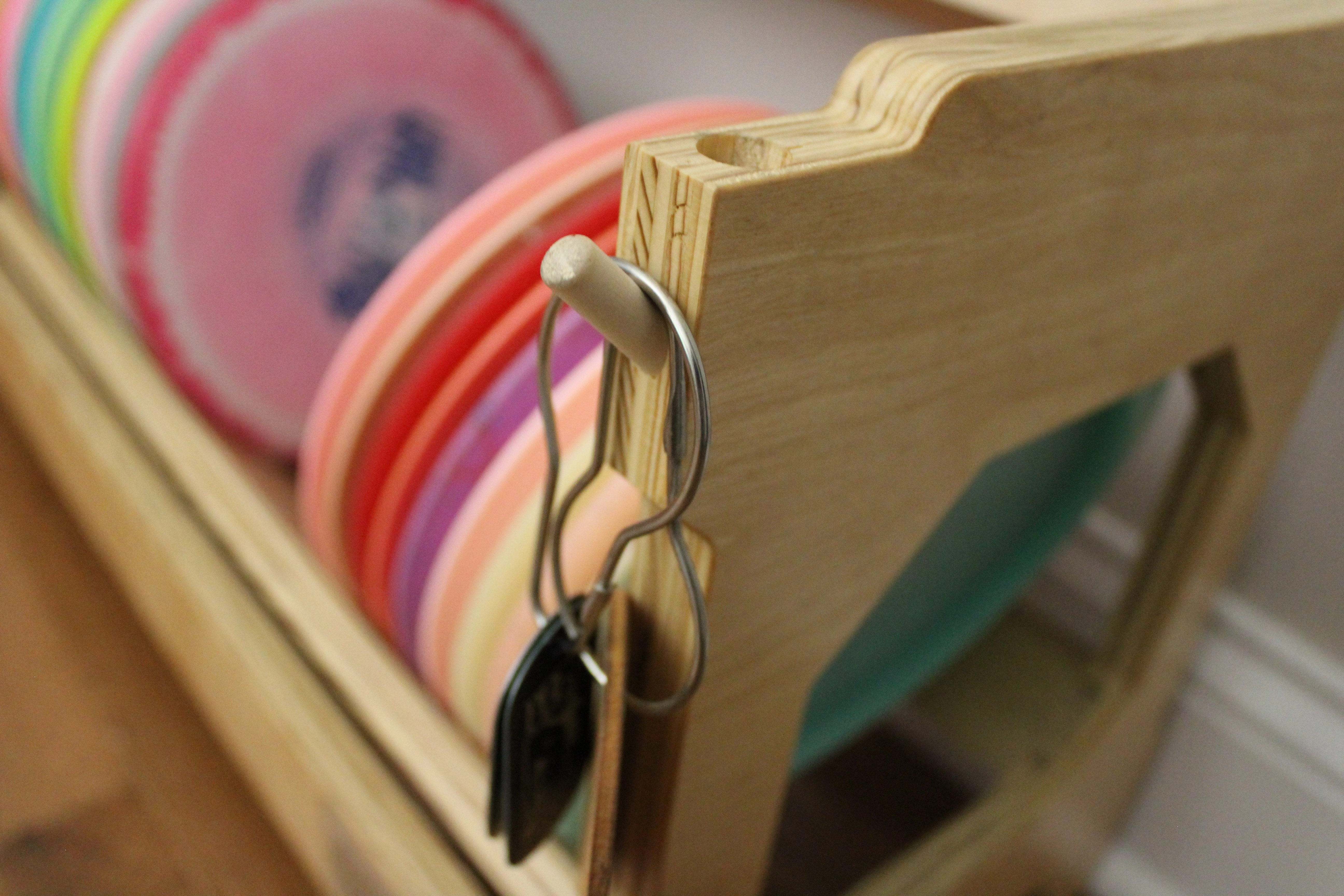 This is a high quality disc storage rack made of wood by Hyzer Disc. The rack is made from American birch with a clear lacquer. It comes with two hooks for towels or tags and includes a built in shelf to hold trophies or discs. It also includes a disc divider. Multiple racks can be stacked on top of one another to hold your growing collection and form a larger rack system. Only one row / rack is shipped with each order. You can order multiple wooden racks to stack them.