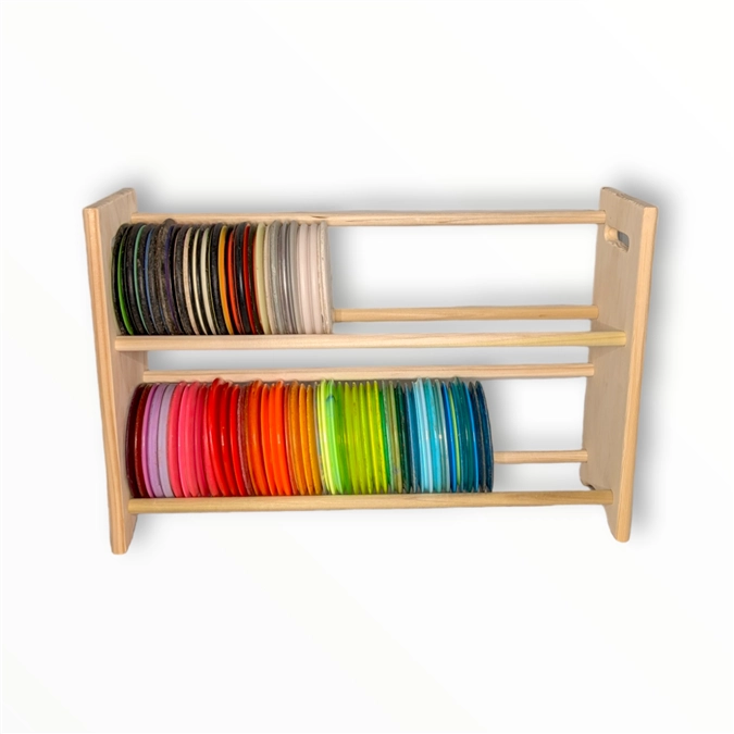 This is a high quality disc storage rack made of wood by Hyzer Disc. The rack i