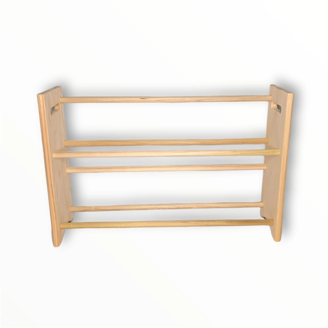Each rack has beveled edges and is completely sanded for a smooth feel and finish. As can be seen in the photos, your discs will sit within three 1" dowels, and each level comes with one bungee cord much like a bookend to ensure they won't fall off of the shelf.