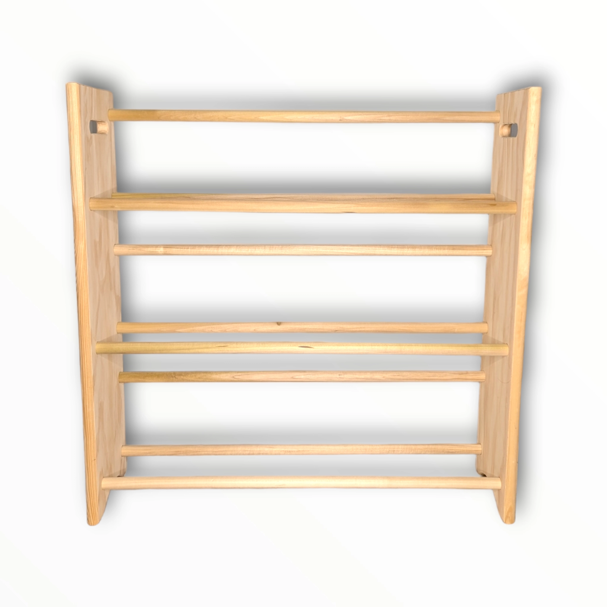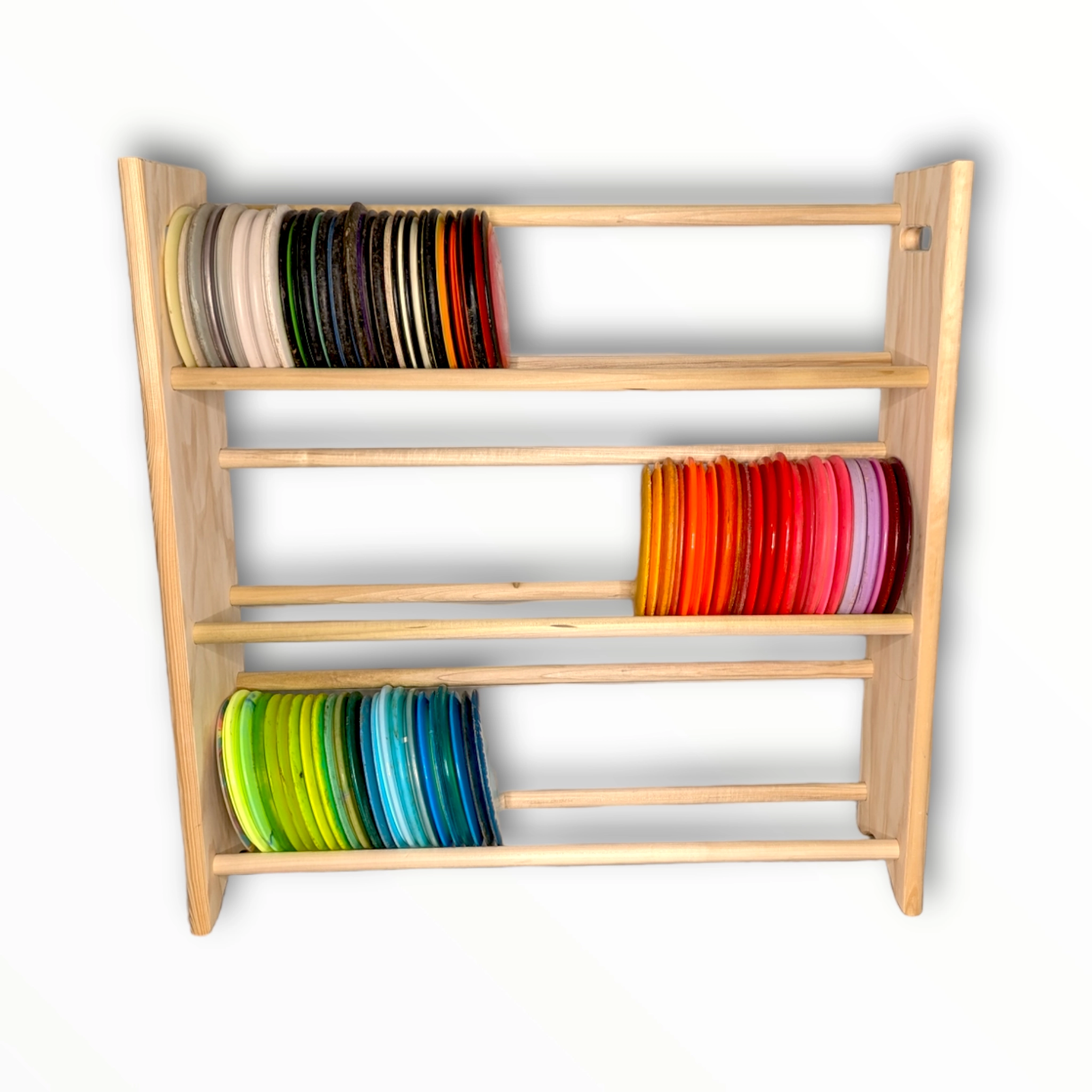 Each rack has beveled edges and is completely sanded for a smooth feel and finish. As can be seen in the photos, your discs will sit within three 1" dowels, and each level comes with one bungee cord much like a bookend to ensure they won't fall off of the shelf.