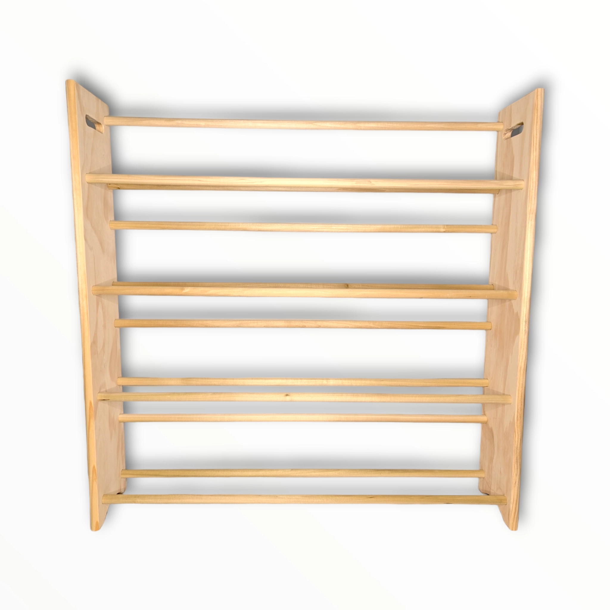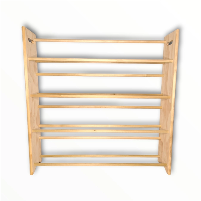 Each rack has beveled edges and is completely sanded for a smooth feel and finish. As can be seen in the photos, your discs will sit within three 1" dowels, and each level comes with one bungee cord much like a bookend to ensure they won't fall off of the shelf.