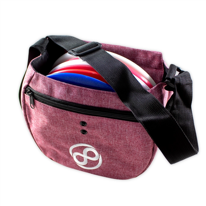 This bag is made from quality, long-lasting material and features an embroidered Infinite logo for a clean, simple look. It has a zipper pocket on the front, two snap positions to close the top flap over your discs for transport or storage, and an adjustable shoulder strap.