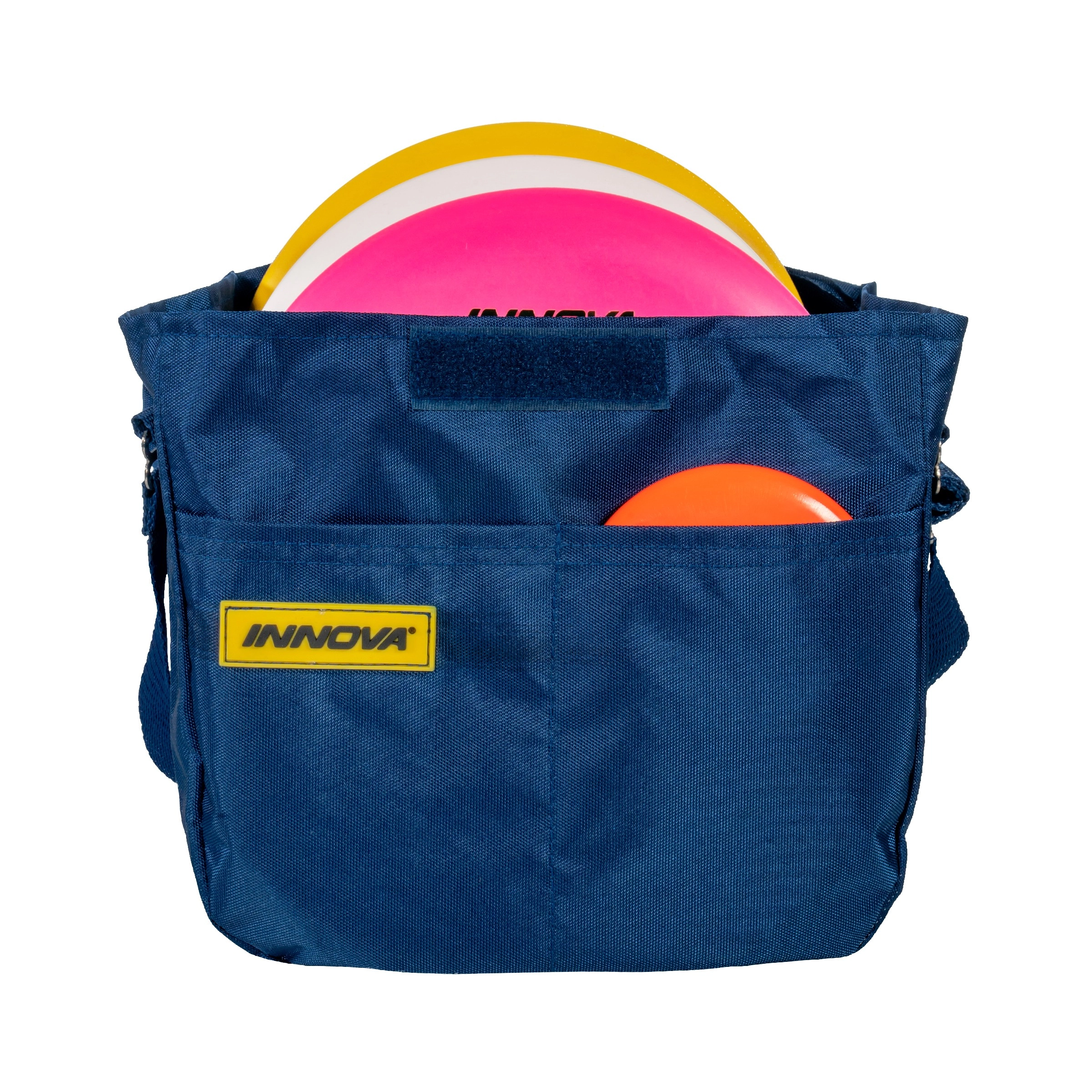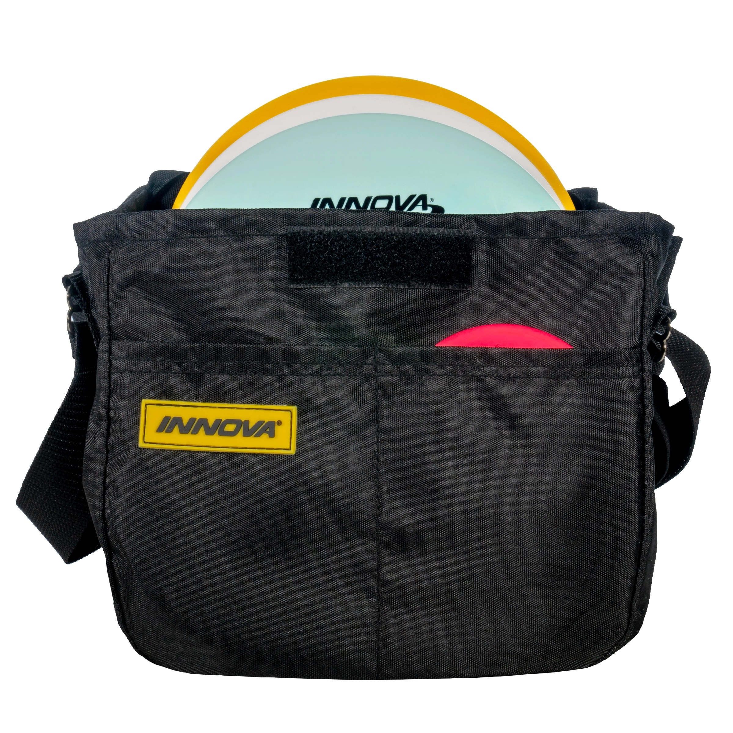 The Innova Go Bag is an excellent minimalist bag. This will hold 8-10 discs. Within its main compartment there are two dividers providing 3 separate pockets to divide your discs. This bag also has two front pockets for the small items. You can fit a wallet, or a mini marker, or keys.