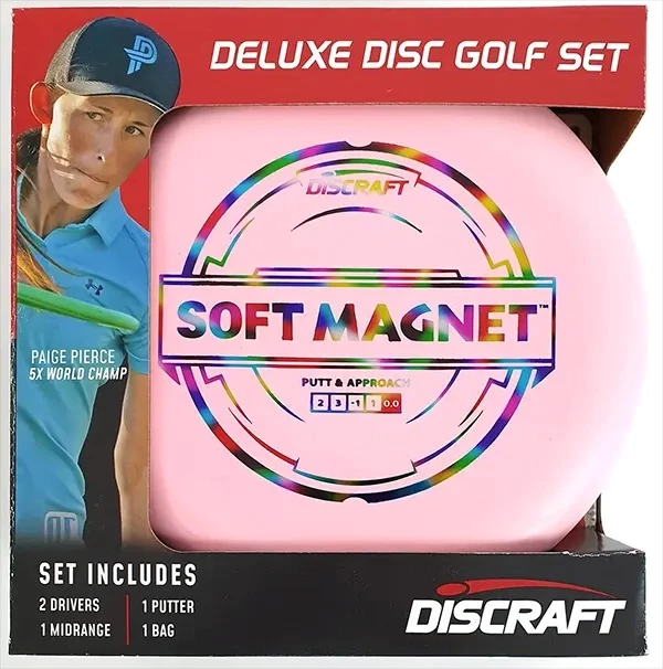 The Discraft Deluxe Disc Golf Set is the step up from the standard Discraft Disc Golf Set. This set includes an additional Driver as well as a disc bag. The Deluxe starter set includes a putter, a mid-range, a fairway driver, and a distance driver, along with a starter disc golf shoulder bag to carry the discs.