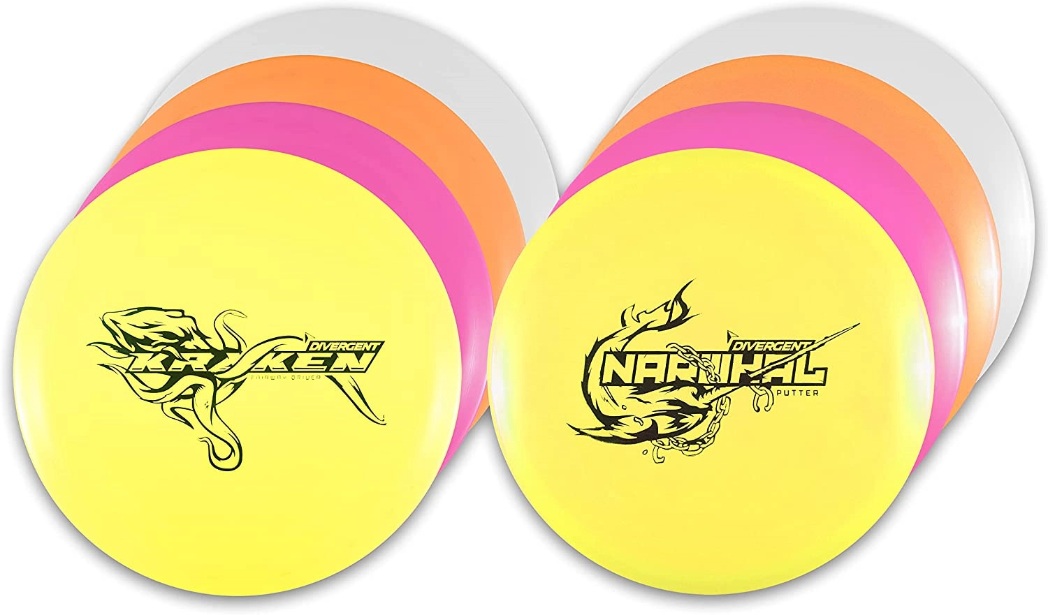This affordable package of discs is perfect for the family or group of friends who want to get some basic discs to start playing disc golf. The package includes 4 Narwhal putters which are excellent for putting, or as easy-to-throw discs for beginners. Plus it includes 4 Kraken drivers for players who want to work on airing out the disc on some great drives. The Kraken is a great disc for new players or as a control driver for experienced players.