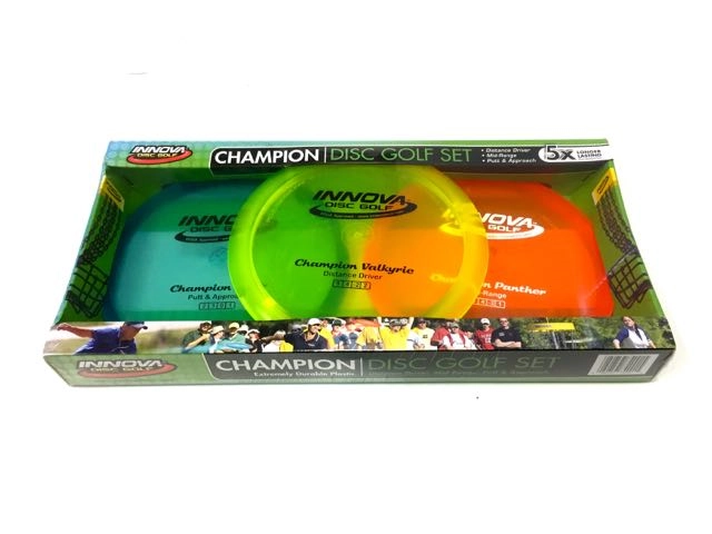 The Innova Champion Plastic starter set gives you three beginner friendly premium plastic discs. This plastic lasts up to 5X longer than base DX plastic discs.