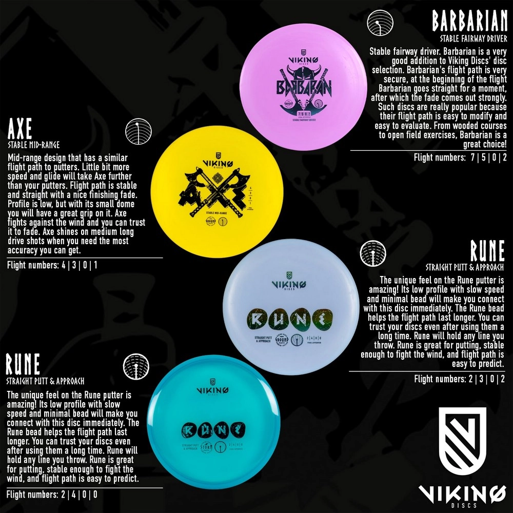The 8 Disc Viking Starter Set includes a mix of Viking Discs in a variety of plastics. This set is geared towards beginner skill level players, as the discs in this set are more beginner friendly than the other sets (but still can be utilized by higher skill levels). This set will give you everything you need to go out and play with a variety of discs and shot types. A pair of putters is even included, as this is a very common practice in the disc golf world. This set includes the following discs: