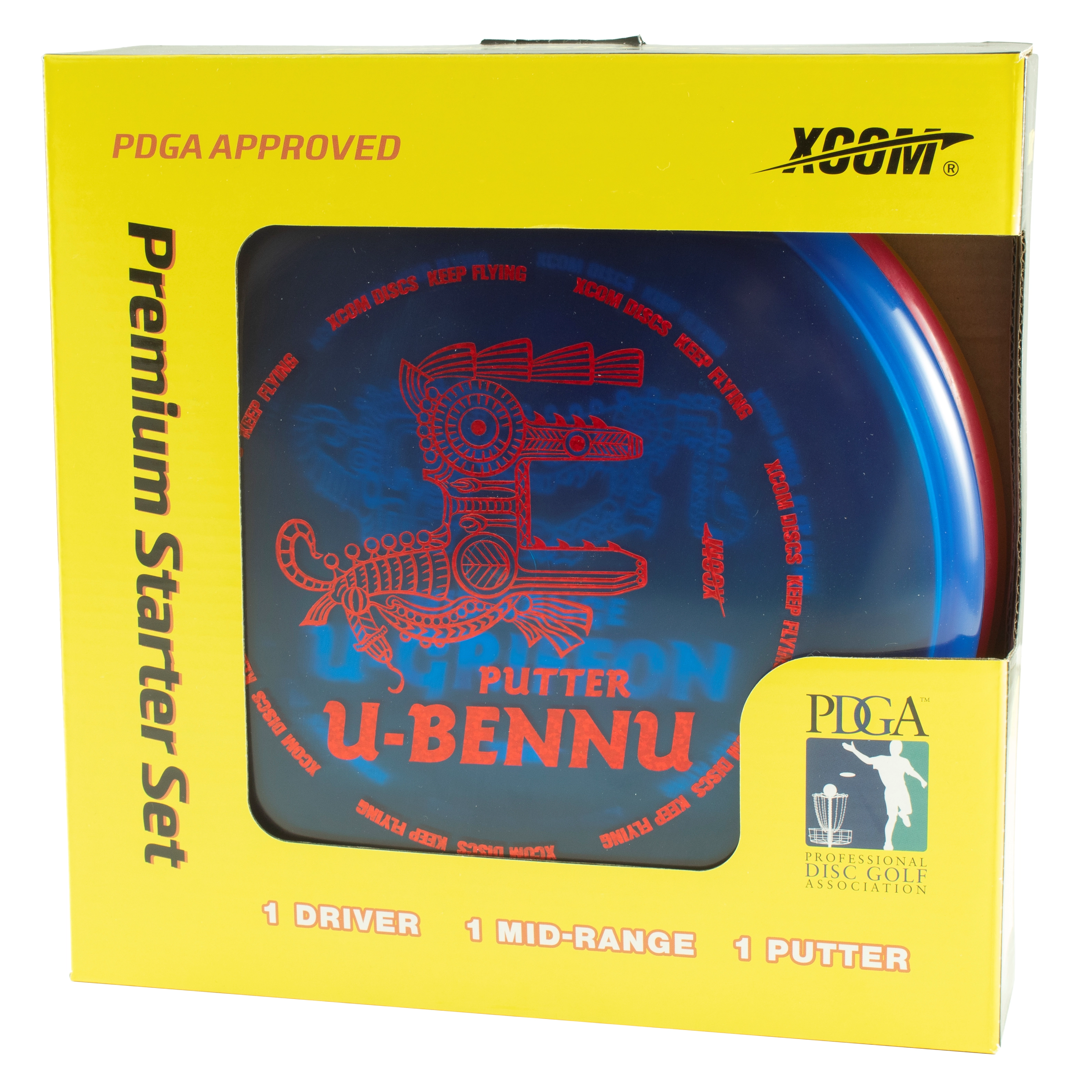 The X-Com premium starter set is an easy, affordable way to get 3 discs in a premium blend plastic. It includes the Bennu, the Griffon, and the Helios. These three discs are all designed to fly well for beginners. These three discs are tuned for straight flight with slower arm speeds. Even children may be able to handle these discs as they get started in their disc golf game. In addition, the discs are PDGA approved for tournament play.