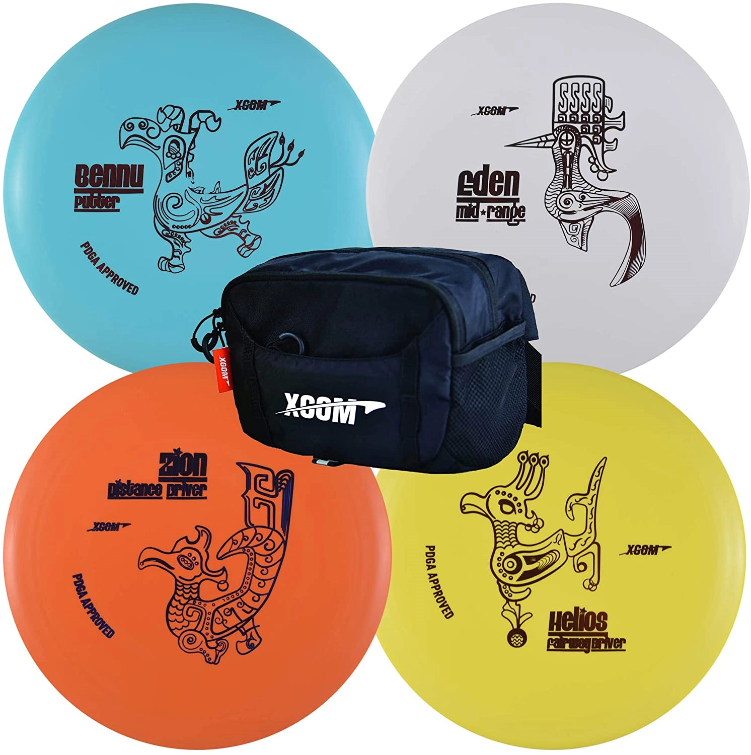 X-Com presents this 4-disc beginner disc golf set which includes a putter, mid-range, fairway driver, and distance driver, plus an easy-to-use hip / fanny bag to carry your set on the course. These are lightweight discs designed for new players or for players with slower arm speeds. These discs are PDGA approved for competitive play.
