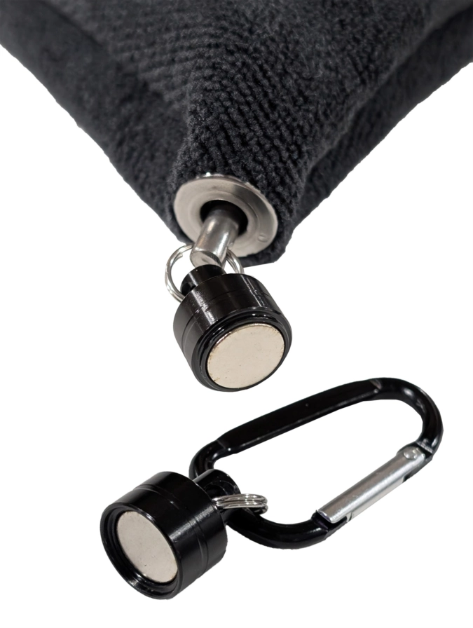 The Dead-Eye Disc Golf Towel is designed for ultimate convenience, keeping your towel clean, secure, and easily accessible. Featuring a center-punched design, it stays off the ground and ready for use, making it perfect for backpacks and carts. The high-powered 8lb magnetic coupler attachment allows for quick removal while ensuring the towel snaps back into place securely, preventing accidental drops. Built for durability, all metal elements are stainless steel, providing years of rust-free performance.
