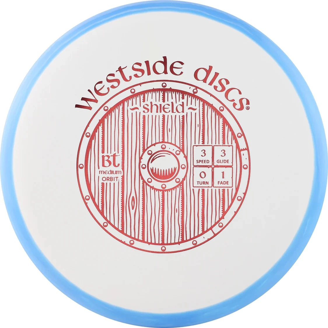The Shield is the overstable Westside putter that was used as part of the 2014 Trilogy Challenge. This putt & approach disc is more stable than the Swan and a straighter flyer than the Westside Harp. This is a very tall disc at 2.5cm tall, and is relatively flat. Like all Westside putters, this disc will be available in the BT plastic blends.